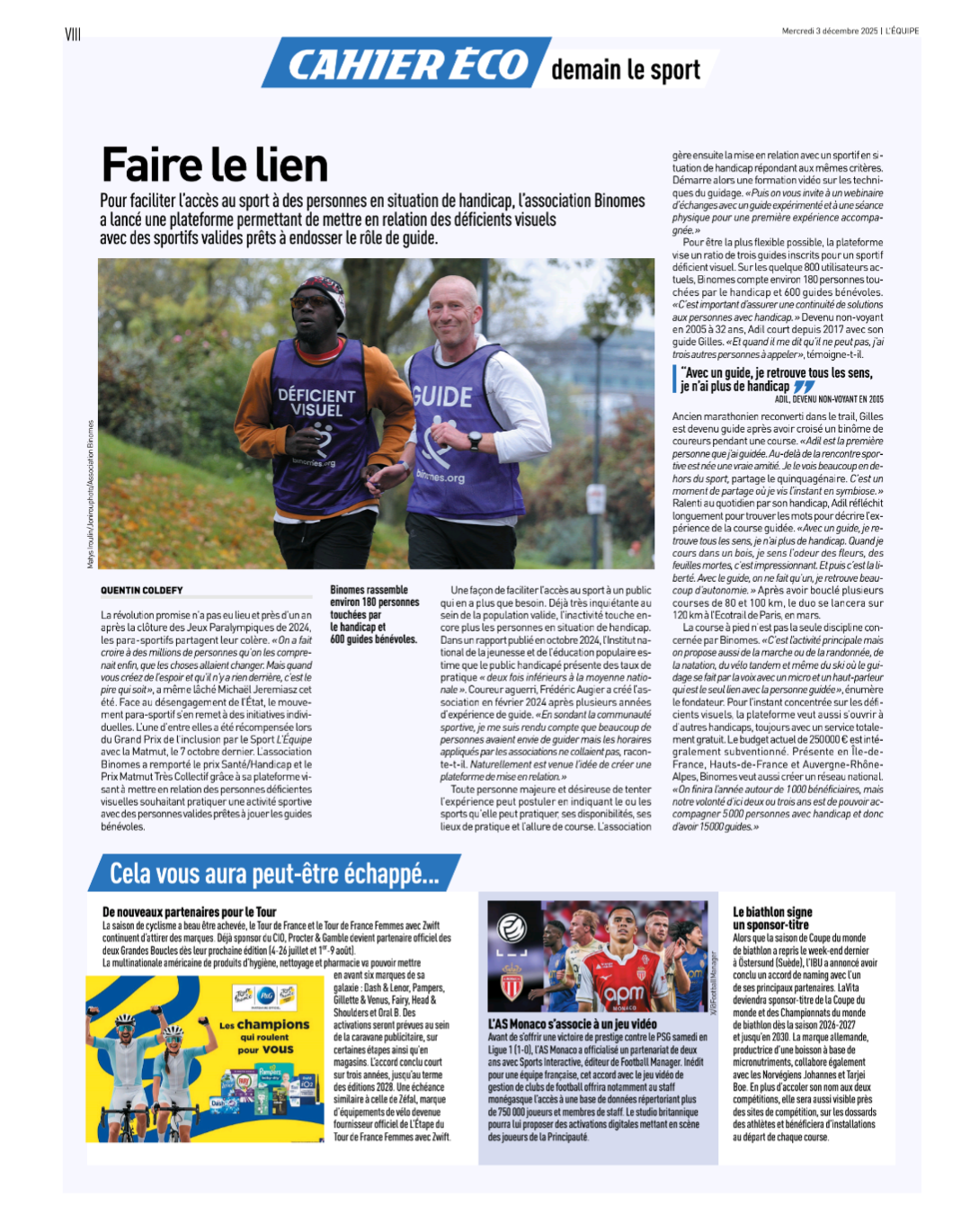 Article du journal L’ÉQUIPE sur l’accès au sport facilité pour les personnes en situation de handicap grâce à l’association BINOMES et sa plateforme binomes.org.